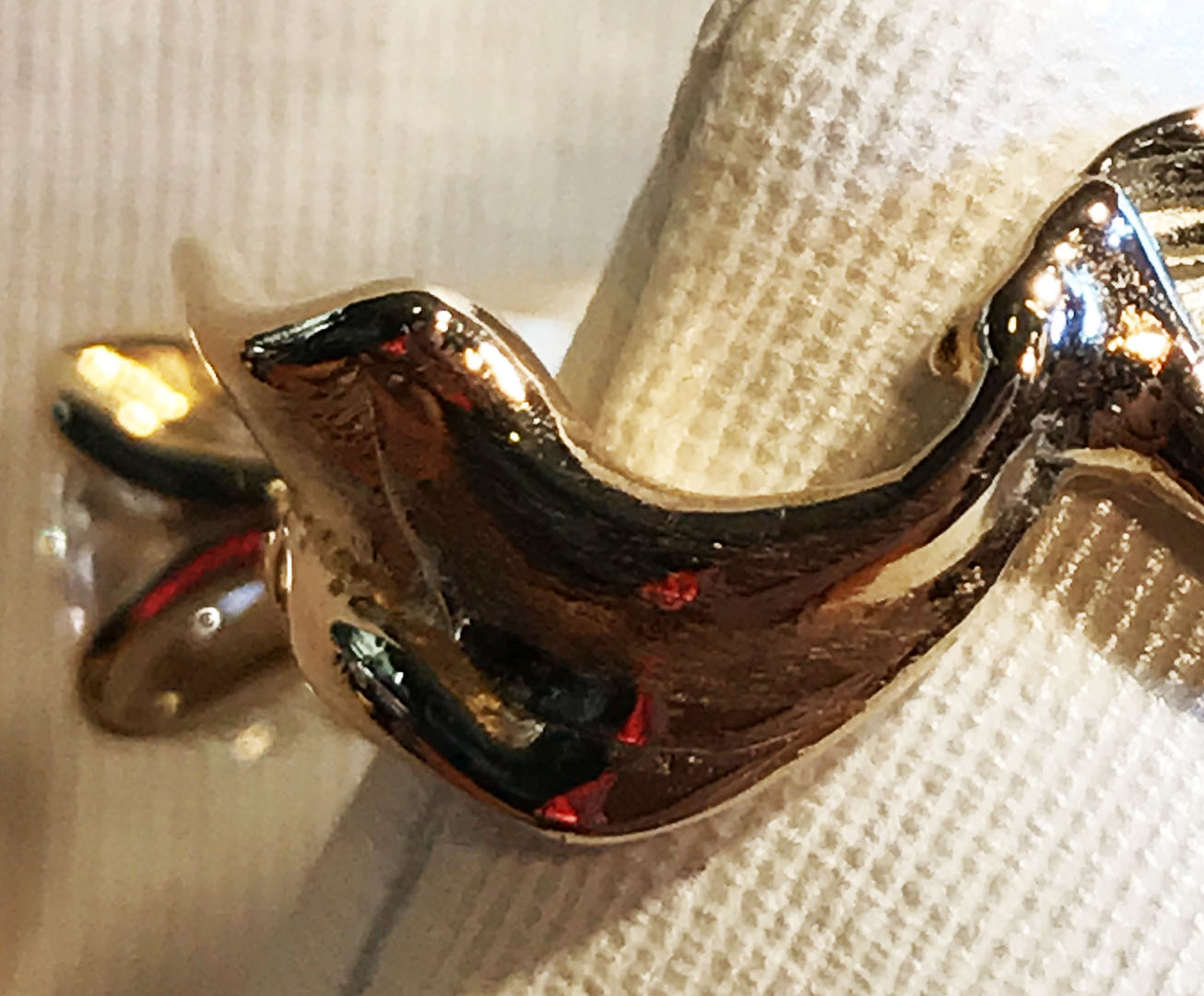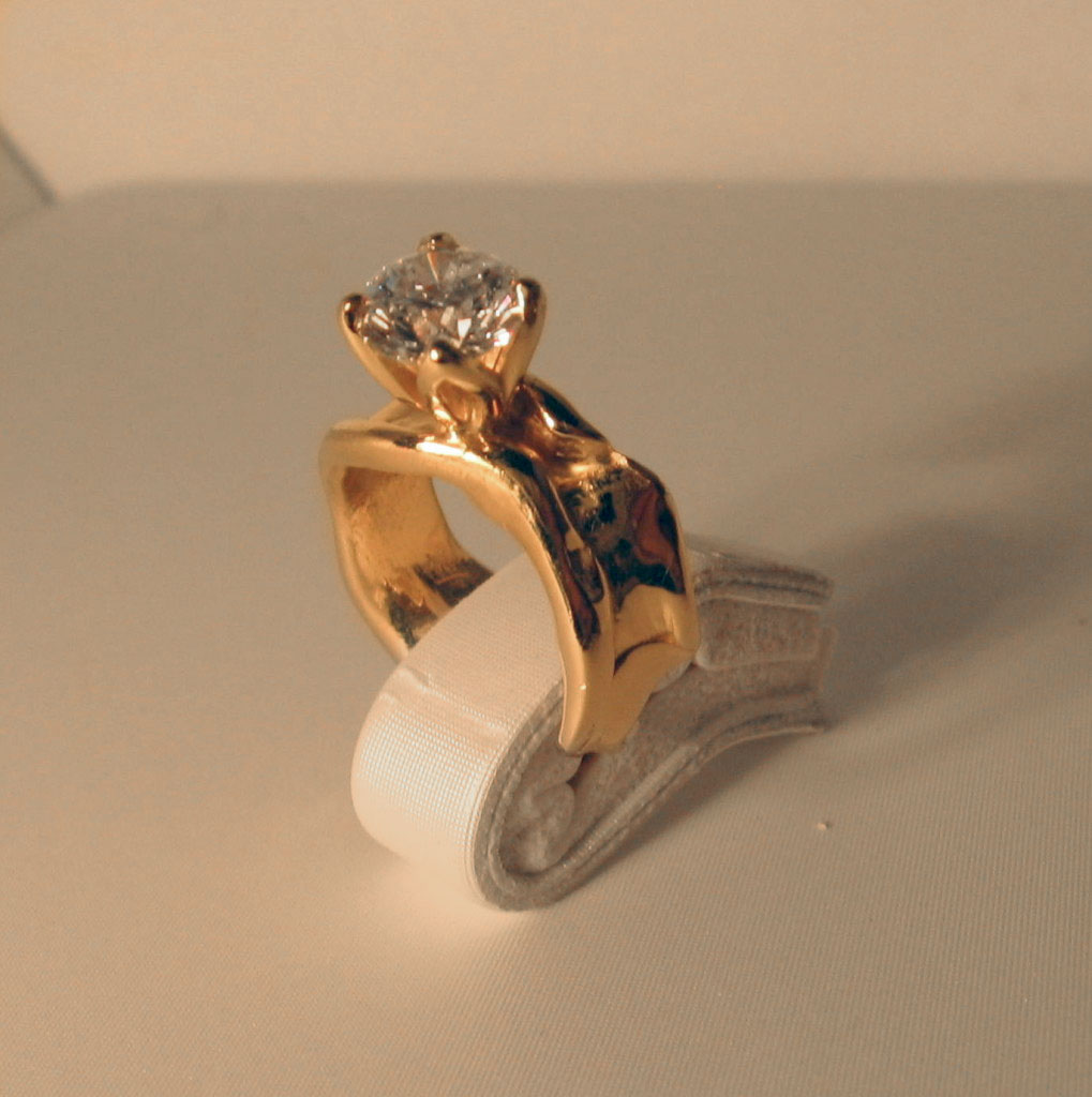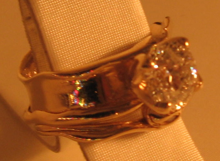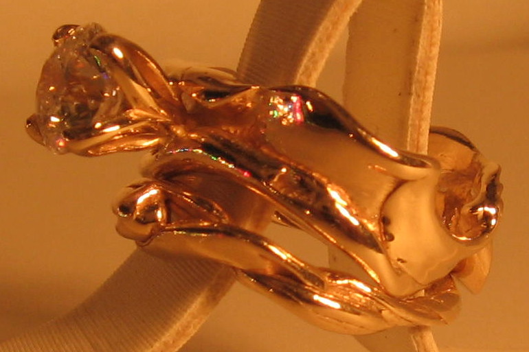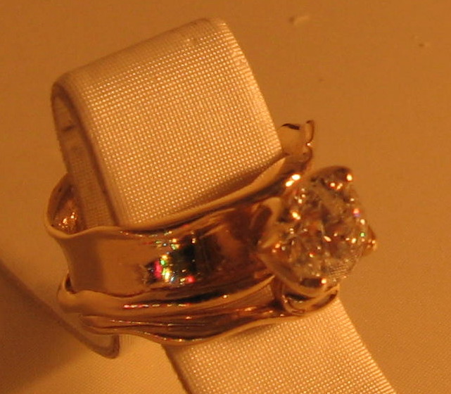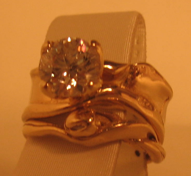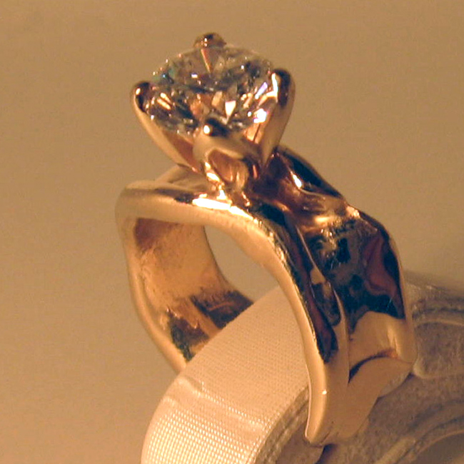 This piece of art represents to me in a beautiful and exceptionally unique way;  the natural undulations of growth that occur within the union of two souls bound by will and fate.  Featuring a 1.52ct round modern brilliant cut diamond H color SI2 clarity.  This natural non-enhanced diamond is featured  in solid 14kt yellow gold and is an exclusive dbg original design.