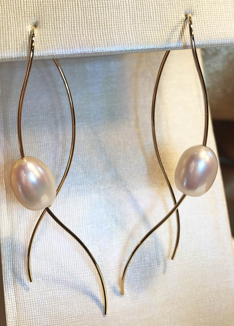 Genuine Pearl Spiral earrings 14kt yellow gold length of earrings 2 inches long.